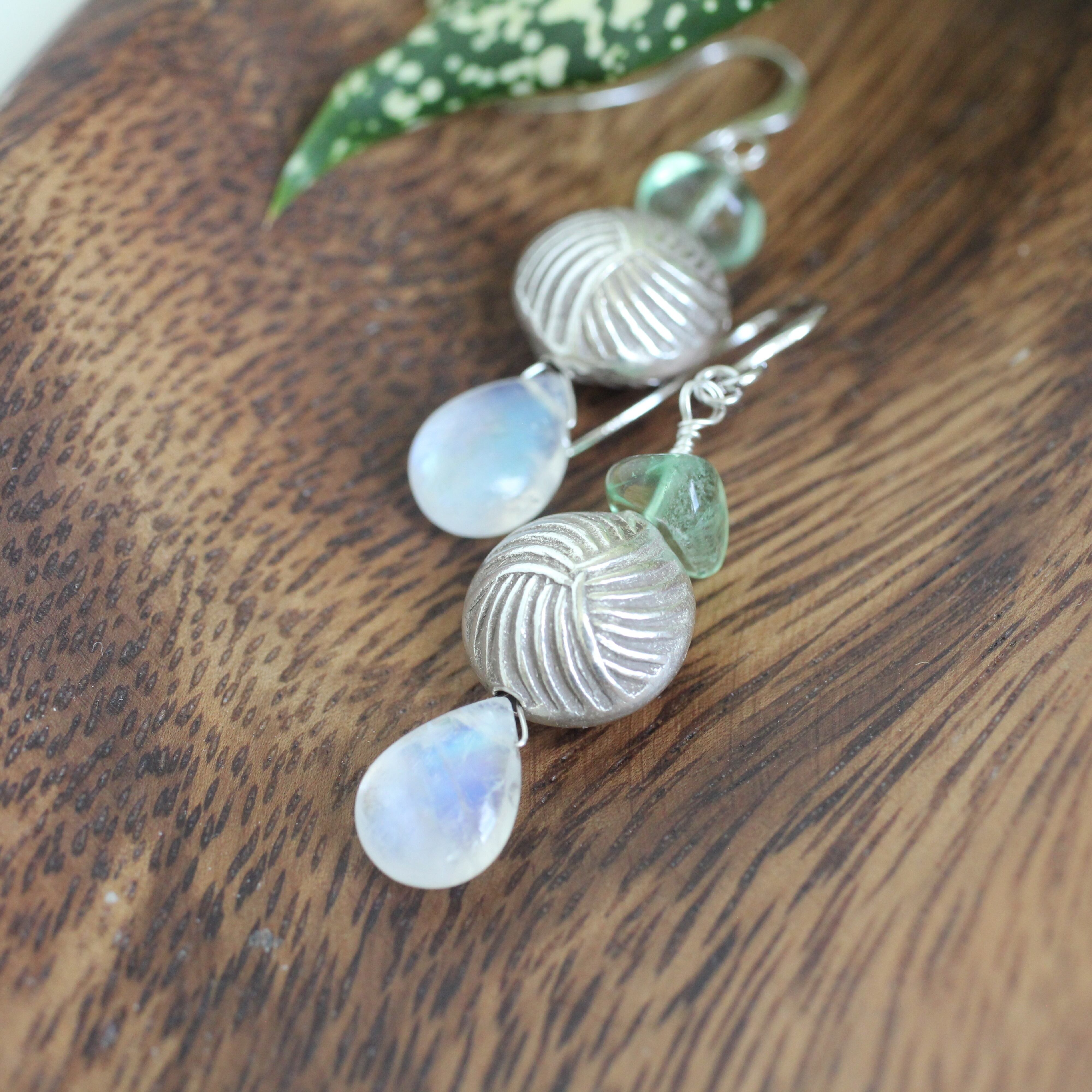 タイの山岳民族のカレン族が製作しているシルバーを中心に、下にブルームーンストーン、上にフローライトを配置しています。