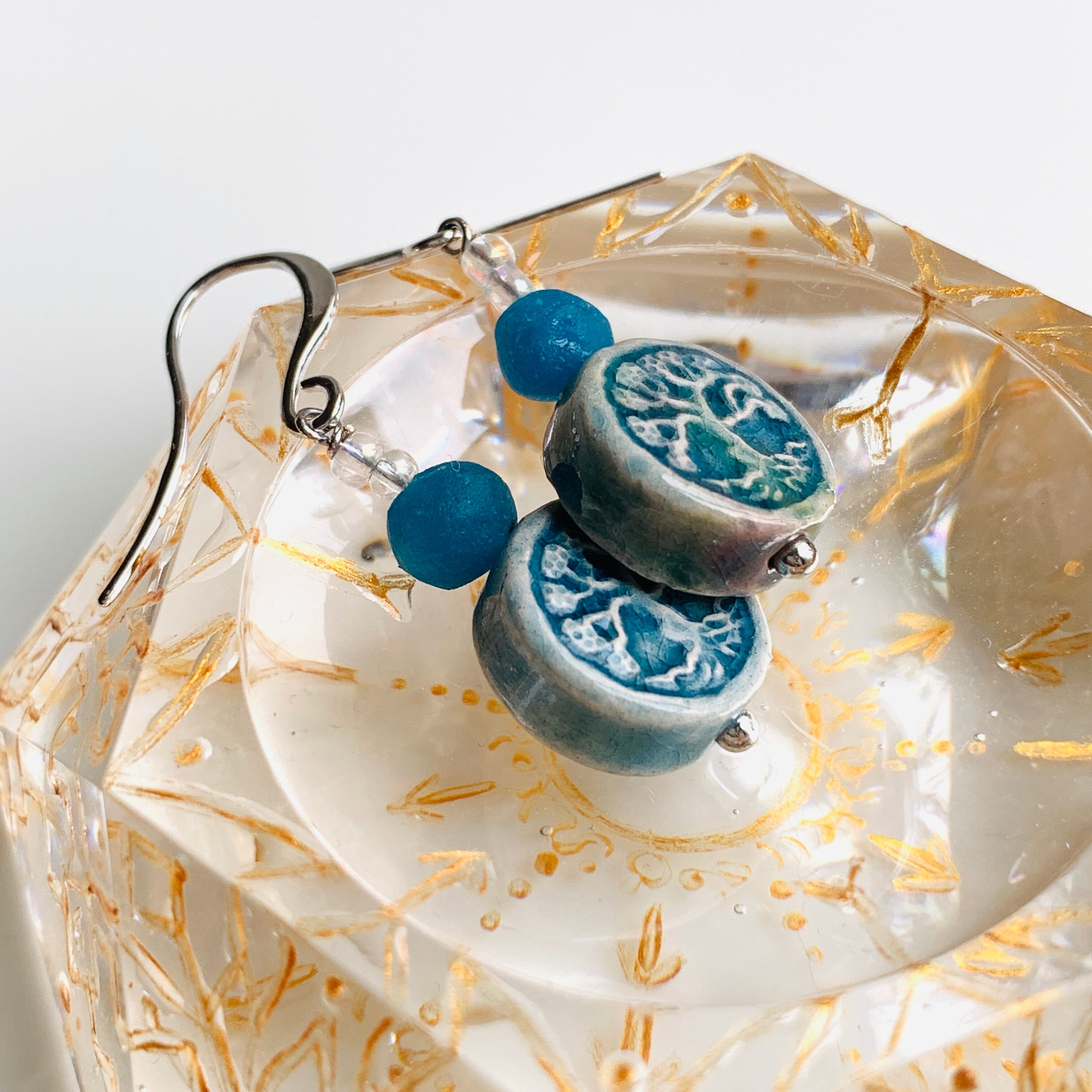 「生命の樹」が描かれたペルー産セラミック(陶磁器)とブルーのローマングラスのビーズを合わせました。