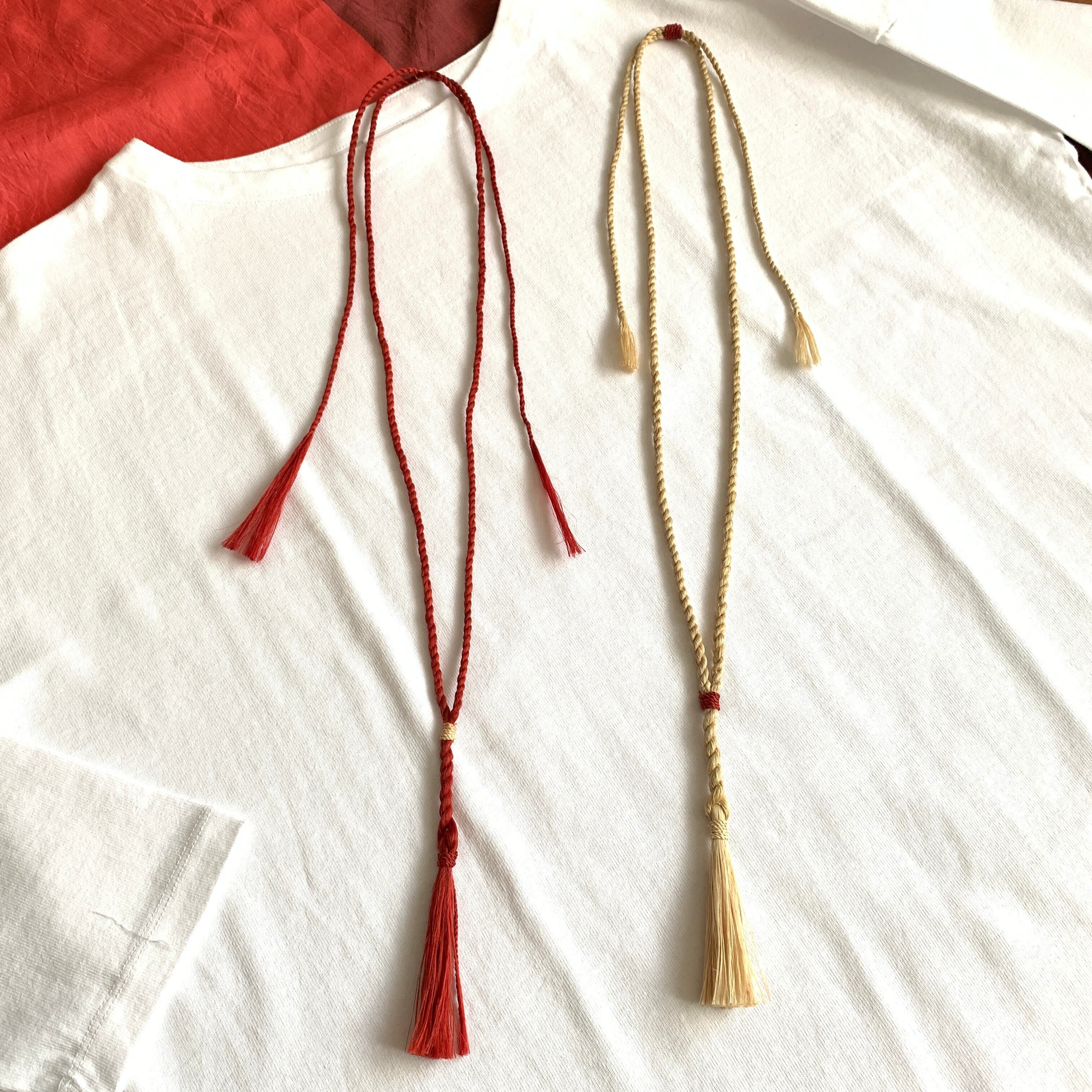 ナチュラルな黄金カラーの精麻をたっぷりと使用してネックレスに仕立てました。